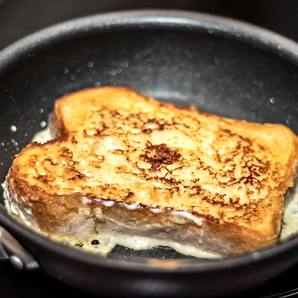 French Toast with Smokey Aubergine Bacon, Berries and Maple Syrup